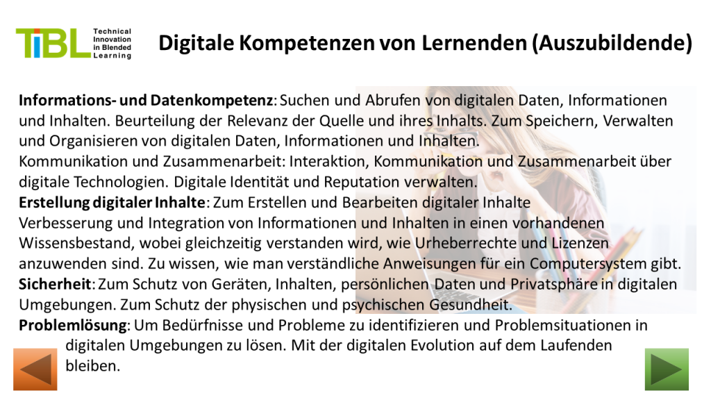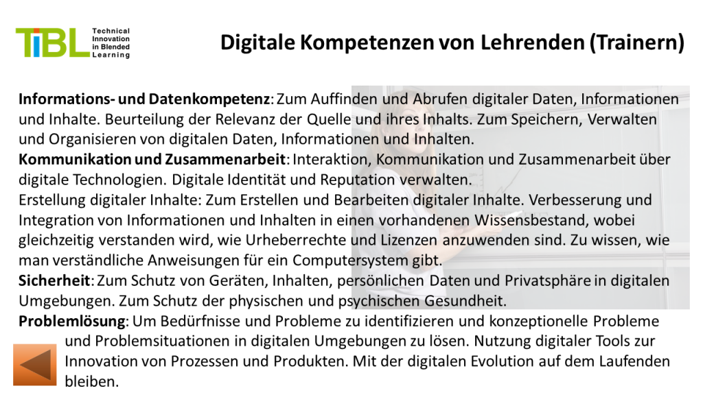 Das Konsortium ermittelte spezifische digitale Kompetenzen, die im Rahmen von C-VET -Kursen erforderlich sind. Dies richtet sich an beide Gruppen von Betroffenen – sowohl Lernende als auch Trainer.