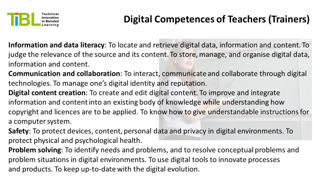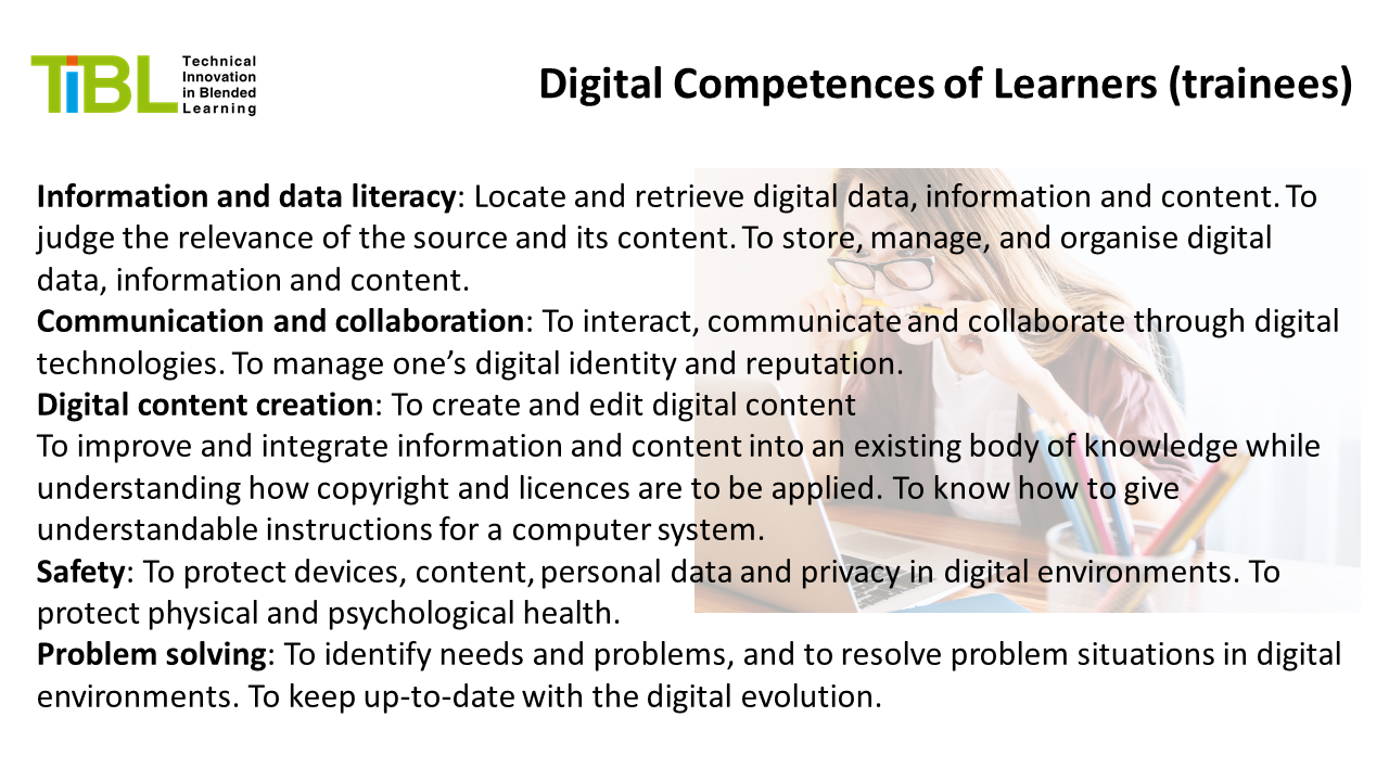 The consortium identified specific digital competences which are necessary in the frame of C-VET(1) courses. This targets both groups of stakeholders – learners as well as trainers.